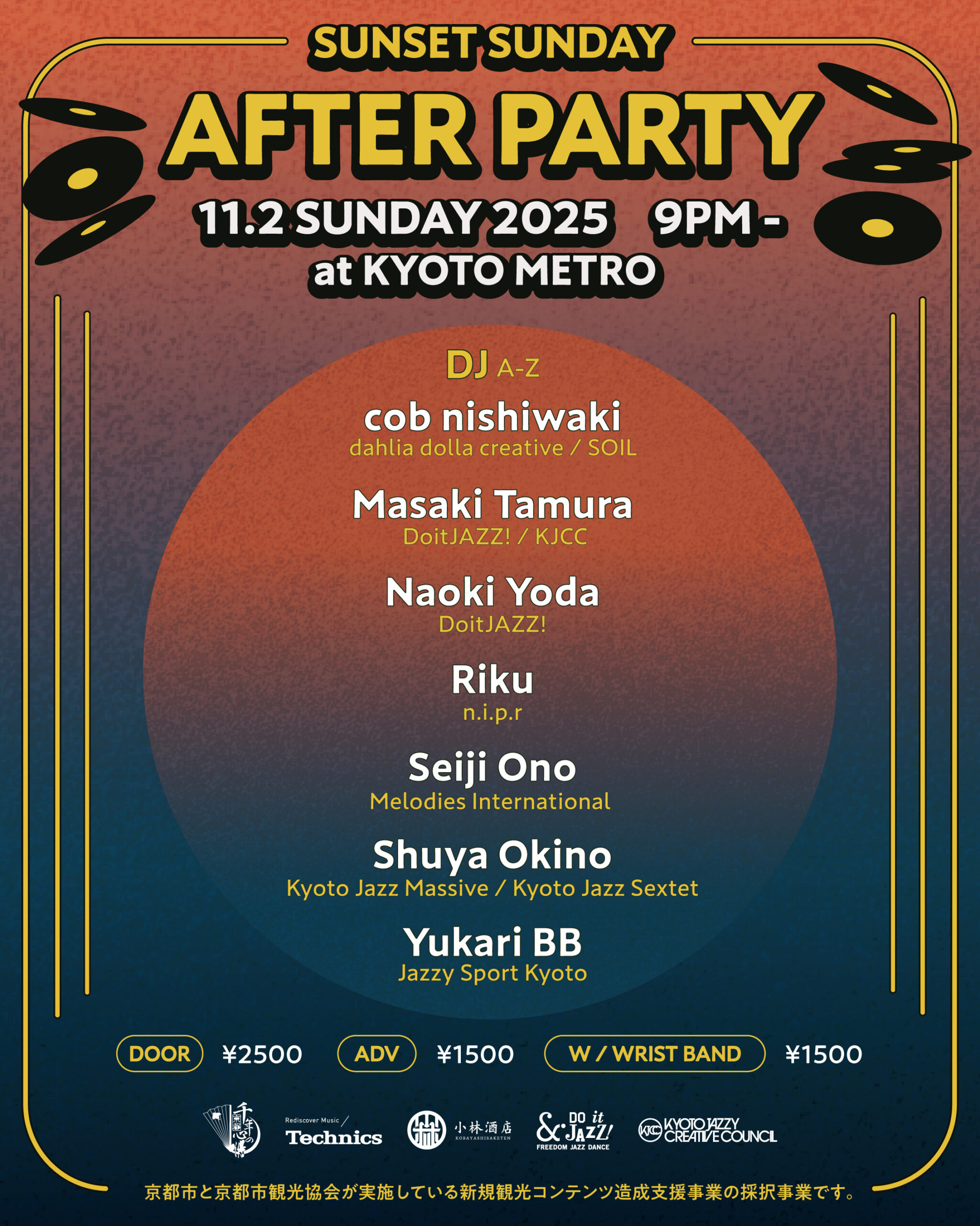 This year, SUNSET SUNDAY begins at Kyoto City Hall Square with music and food bringing people together. As the sun sets, the celebration moves to Kyoto’s legendary CLUB METRO for the After Party. DJs from different generations, active both in Japan and overseas, come together for a night of music and connection that lasts until late. From afternoon to night and into the early morning, it’s a full day to experience the energy and culture of Kyoto.