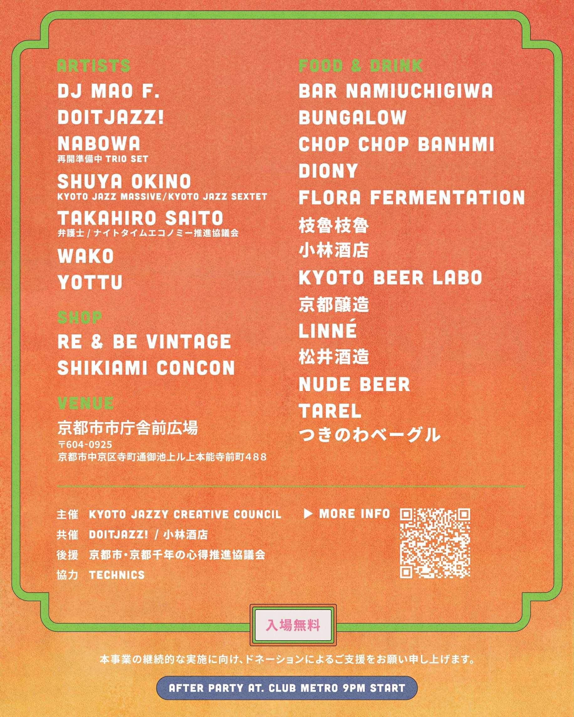 京都のモダン建築である京都市市庁舎前広場を舞台に、音楽と食文化を中心に人々が集い交流する文化イベントを開催する。京都観光局「新規観光コンテンツ造成支援事業」に採択された本プロジェクトは、DJやアーティストの公演に加え、酒造やクラフトビール、ワインインポーターなど多彩な出店が広場を彩り、来場者は音楽と食を通じて豊かな時間を楽しむことができる。公共施設である市庁舎の理念を背景に、入場無料の開かれた空間として運営され、まちの中心に人が集まり、表現が交わることで新しい京都のカルチャーが芽吹き、ローカルの魅力が広く発信されていく。昼の賑わいは夜の「CLUB METRO」へと引き継がれ、深夜まで熱気が続く一日となり、やがて持続可能な文化事業へと発展していく。